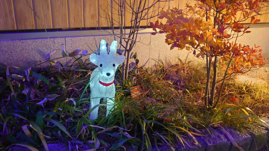 園児たちが喜ぶキャラクター系のサンタクロースやトナカイ、キラキラと輝くドロップライトを飾り付けました。